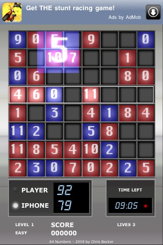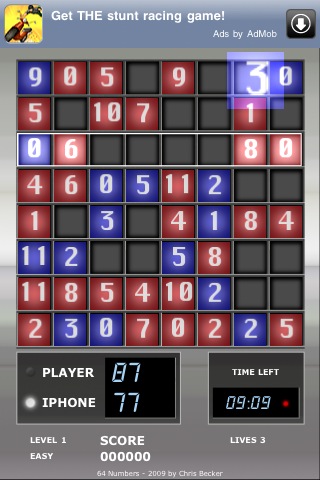 64 Numbers is a strategic puzzle game. The numbers 0-11 are distributed on a game board with 64 fields. You choose horizontally, the iPhone (your opponent) chooses vertically. Blue numbers increase your score, red numbers decrease it. The game finishes when no more fields are available.